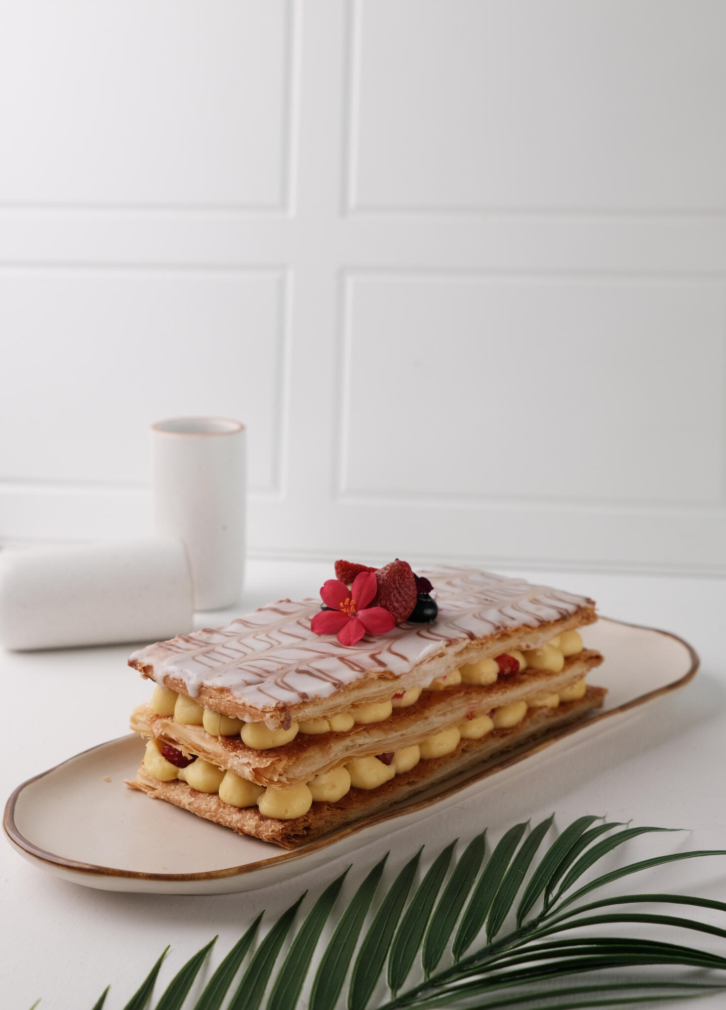 Mille Feuille; The classic French dessert that delivers the taste of crunchiness and sweetness. Taking raspberry for the acidity and vanilla for the sweetness and aroma was indeed the biggest success. Building upon the classic itself, I choose to not make it more complex but instead make it more simple. The Mille Feuille is simply designed to be relatively sweet, creamy, classic, and special.